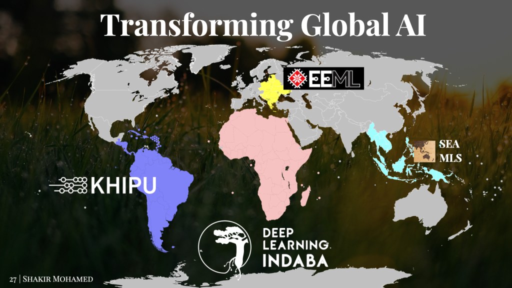 我想分享自己的经验,将这种社区理论付诸实践。大约4年前,我是一群人的组成部分,以创建一个名为Deep Learning Indaba的新组织,其任务是在整个非洲大陆加强机器学习。在我们的多年工作中,我们已经能够在非洲各地建立新的社区,建立领导力并认可卓越的人工智能开发和使用。看到非洲各地的年轻人发展自己的想法,第一次展示他们,获得他们的工作认可,并在同龄人中知道他们的问题和方法很重要,这是他们的方式的一部分,这是一种荣幸。正在独特地塑造我们大陆的未来。我很自豪地看到,除了东欧,东南亚,南亚和南美等其他群体也跟随同样的步伐,此外还有其他鼓舞人心的社区群体,例如“黑死病”,“非洲数据科学”,人工智能中的黑人和人工智能中的酷儿:所有人都对其社区负责,并开展基层运动以支持AI,对话和变革。回顾过去的五年,我相信我们现在可以诚实地说,由于这些群体的奉献和牺牲,全球AI现在更加全球化。