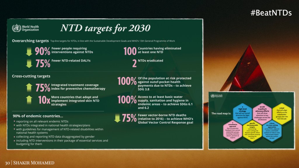 当我一起结束旅程时,我想与一个明确的变革使命共享一个问题领域,这构成了今年的Indaba挑战赛。我要您考虑的变革使命是消灭被忽视的热带病(NTD)。约有14亿人口(占世界人口的六分之一)患有一个或多个NTD,他们被忽视是因为他们普遍困扰着世界上的穷人,而且历来没有像其他疾病那样受到广泛的关注。忽视这个词很重要,因为一个非常常见的词句强调:“被忽视的疾病也是被忽视的人民的疾病”。在这里,殖民地的作用很重要,因为我们必须问一个问题,为什么在历史上和现在这样的忽视不仅存在于NTD,而且存在于许多要求AI4Good的地区。